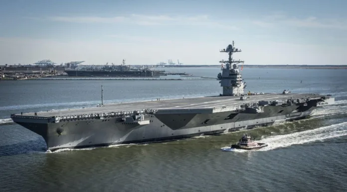 El buque líder de la última clase de portaaviones de la Marina de los Estados Unidos se lanzo en pruebas cruciales de mar durante el...